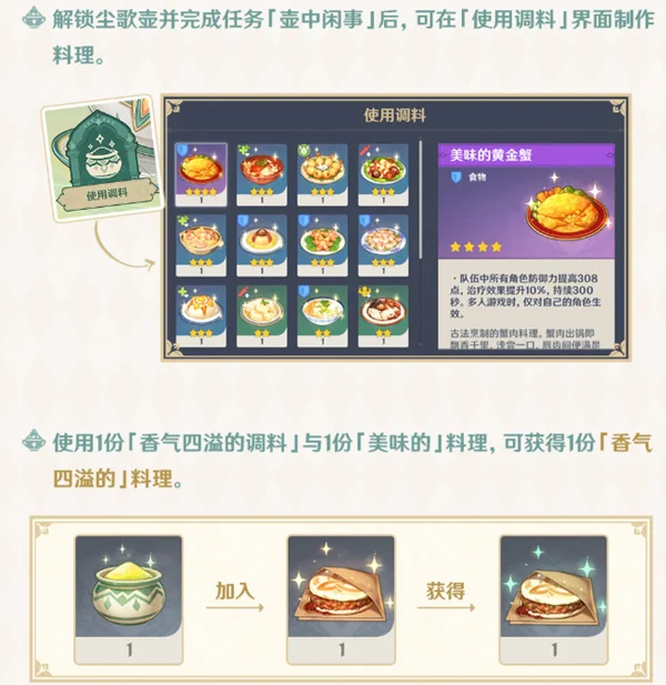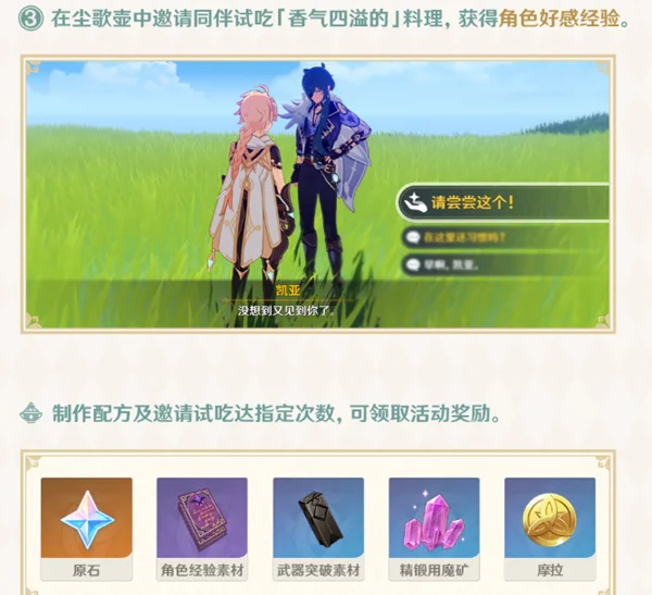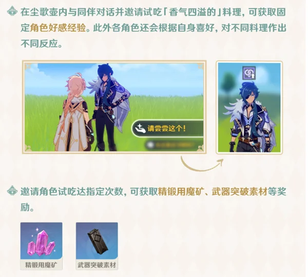 冒险等阶≥28级且完成任务「壶中闲事」,可进行相应的料理制作并邀请角色试吃