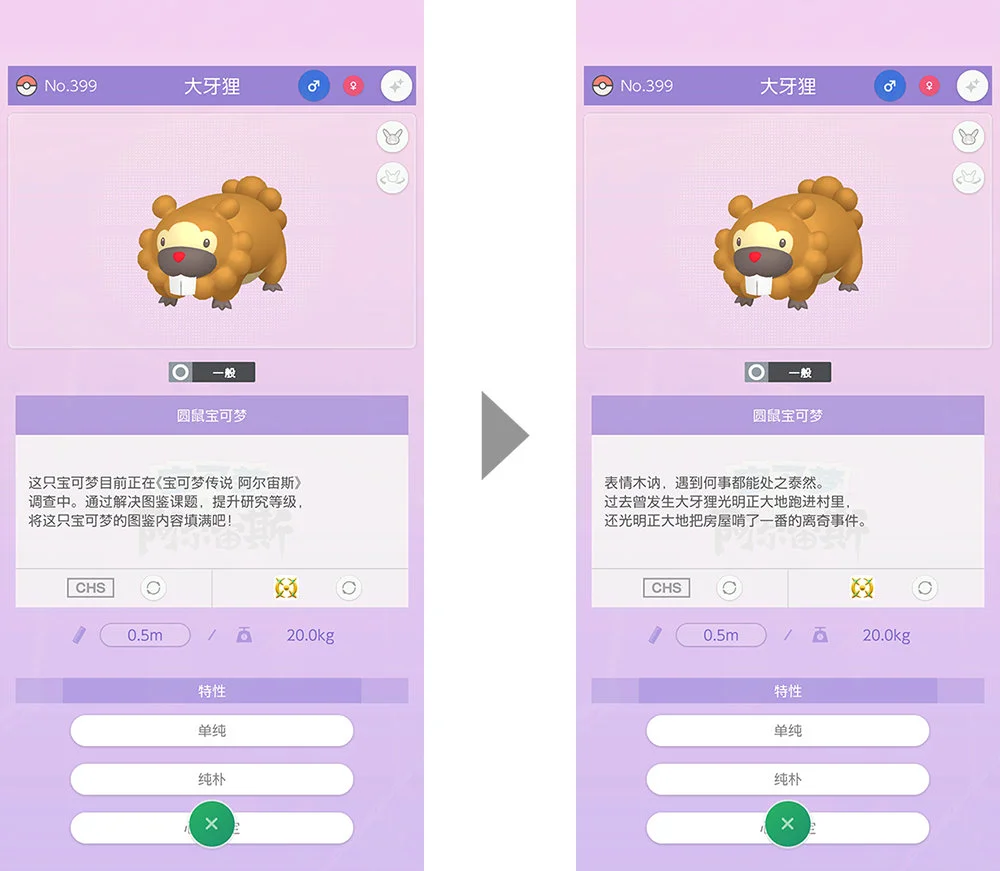 在阿尔宙斯中,玩家的目标是制作第一本宝可梦图鉴 。因此,在 HOME的全国图鉴中,将根据关联的阿尔宙斯保存数据的图鉴完成情况来更新图鉴的说明文。