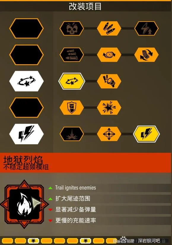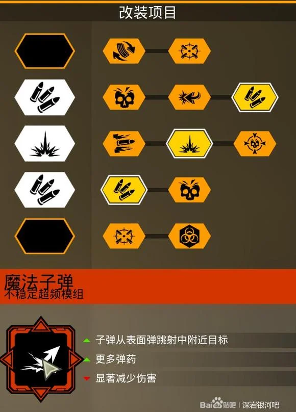 火箭疾速飞弹,因为这个模组就是增强直伤,削弱AOE和AOE范围,所以第一行的“扩大爆炸范围”是不推荐点的,第四行选弱点而不选范围伤害也是同理,第三行的弹夹推荐,要不然会经常性换子弹,第五行建议眩晕,用起来比较安逸。