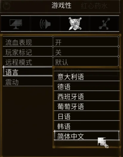在设置的这个游戏性标签里,简体中文要向下滑倒列表底部。