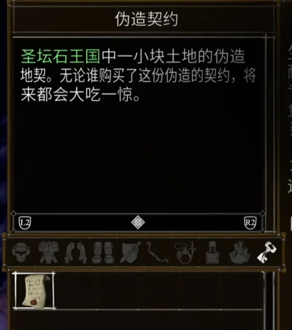 圣坛石王国中一小块土地的伪造地契。无论谁购买了这份伪造的契约,将来都会大吃一惊。