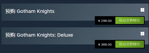 哥谭骑士这款游戏分别有标准版和豪华版两个版本供玩家购买,其中标准版价格为298元,豪华版价格为388元。
