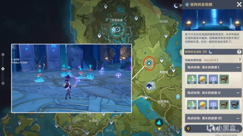② 2.6版本更新后,低配版完成方法,在采樵谷这个位置的碉楼里,有刚好4只冰、水、火、雷小史莱姆,跳进去就会刷出来,只需要有一个砂糖就行(其它风元素角色也可以)(切记把装备都扒干净!小史莱姆不抗揍!)