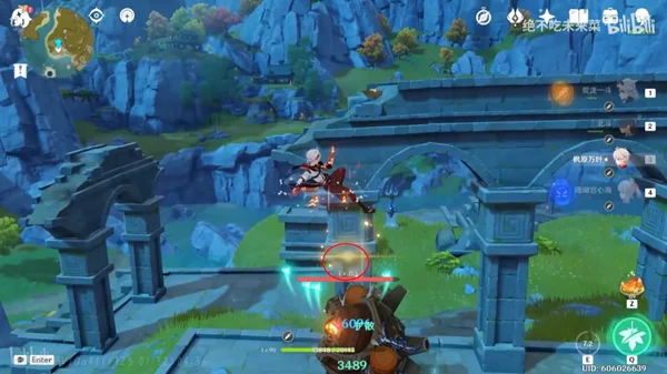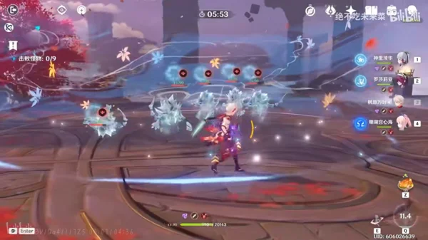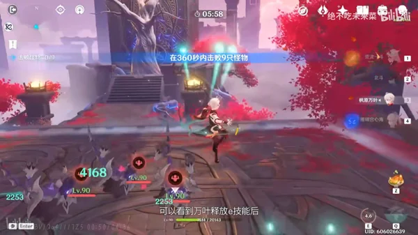 然后凯子哥e多怪挂强冰(此时注意不要把之前的弱水反应水)然后就可以万叶大招染水扩冰
