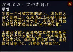 生成一个可被攻击的敌人,该名敌人会不断施法。在成功施法或被打断施法之前免疫任何伤害。成功施法后会对所有玩家造成6.607点宇宙伤害。