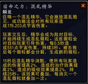 玩家交互后,精华会成为敌对目标,开始持续生成混乱微粒。这些微粒会对自标玩家引导伤害,每0.5秒造成551点宇宙伤害,持续3秒。被击败后每个微粒都会分裂,生成新的微粒。15秒后混乱精华消散,使所有玩家造成的伤害提高2%,造成的治疗效果提高2%,造成的吸收效果提高2%,持续25秒。该效果可叠加,每消灭一个混乱微粒就叠加一次。