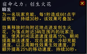 效果移除时向附近地点迸发创生火花,为落点附近3码范围内的玩家注能,使其时间流逝速度提高15%,期间提高施法速度,攻击速度冷却充能速度,以及周期性效果生效速度,并额外提高25%的移动速度,持续30秒。
