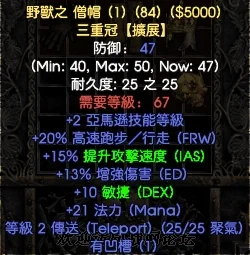 武器盾牌=双精神(大量抗性法力)、双冷静抓(3陷阱20攻速有用技能2孔,非常的难,靠运气)(IN13#)