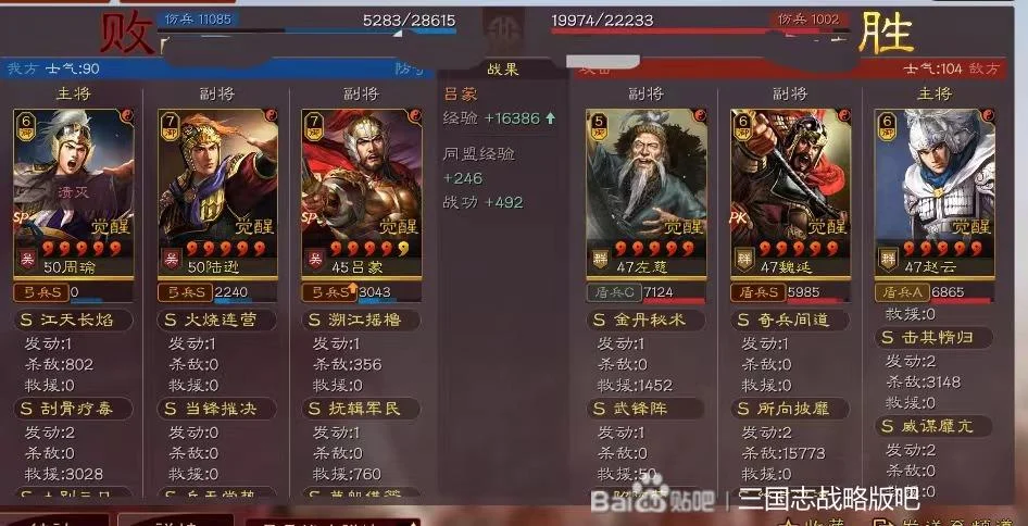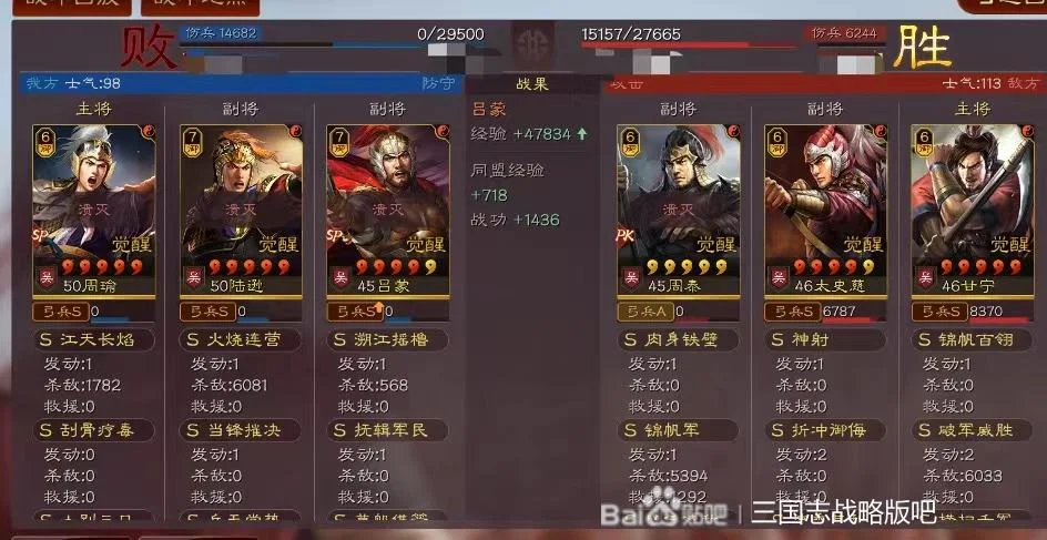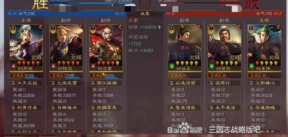 本人对于Sp吕蒙可谓是异常期待,净化加反手控制外加高额属性。觉得吴国继程普之后又迎来新的顶级辅助,所以直接在出了卡包之后抽到快满红(为了对比满红程普,白板肯定没有可比性)。测试队伍为社稷弓,加了弓兵宝物,外加踩踏马,援助甲(因为没有白衣)。拉到45级测试,发结论前发几个战报: