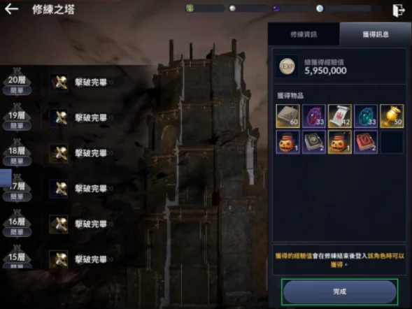 - 可以确认击破修练之塔所获得的经验值、奖励