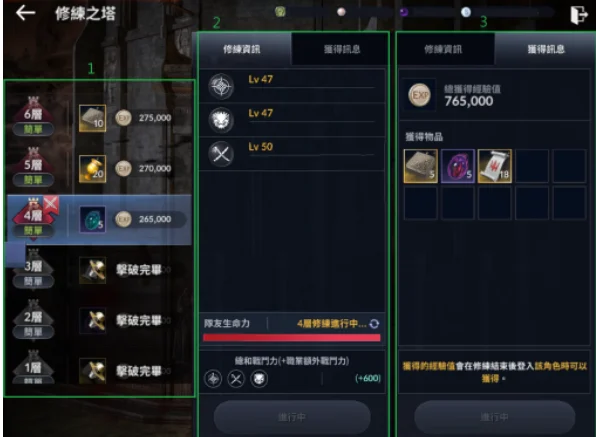 结束修练后,角色选择画面上可以确认透过修练之塔所获得的经验值,该角色登入游戏时便可获得经验值。