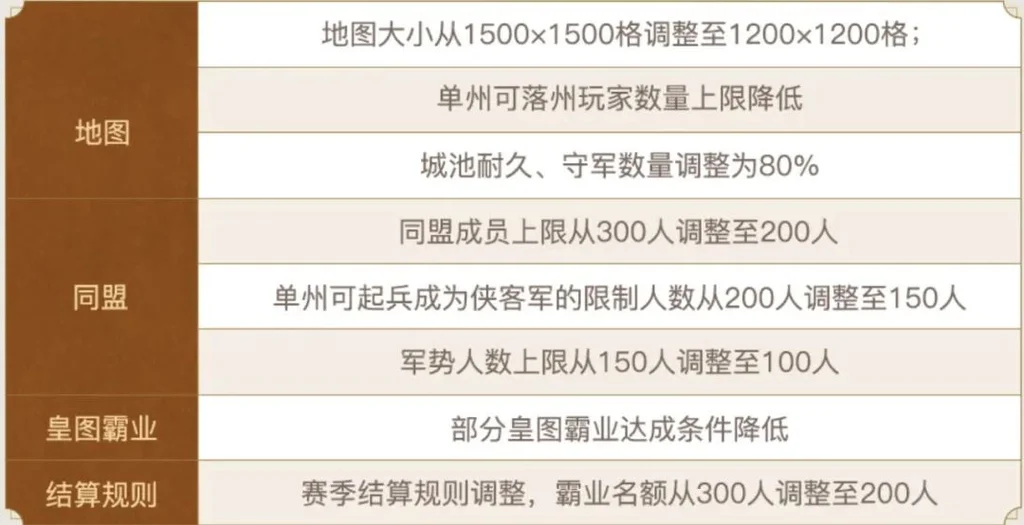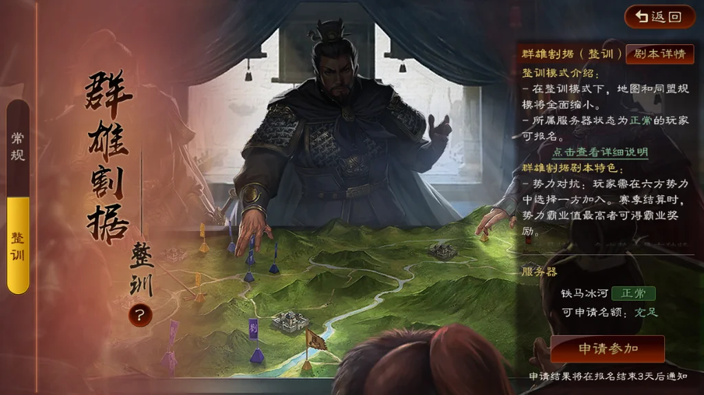 整训模式剧本与常规剧本玩法内容一致,但地图和同盟规模将缩小,主公会以更小的团体进行战略上的布局与外交。