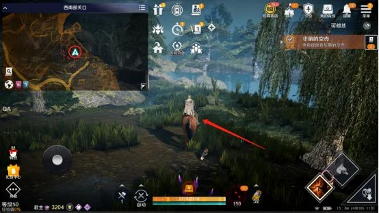 3、接下来我们就根据任务的提示,前往海岸边的码头的左边草丛附近就可以下马慢慢寻找一只红壳小螃蟹了,由于它体型很小,所以冒险家们要仔细看哟~在箭头所示的地上有一个发光的小贝壳,走到附近就提示已完成【华丽的空壳】任务。