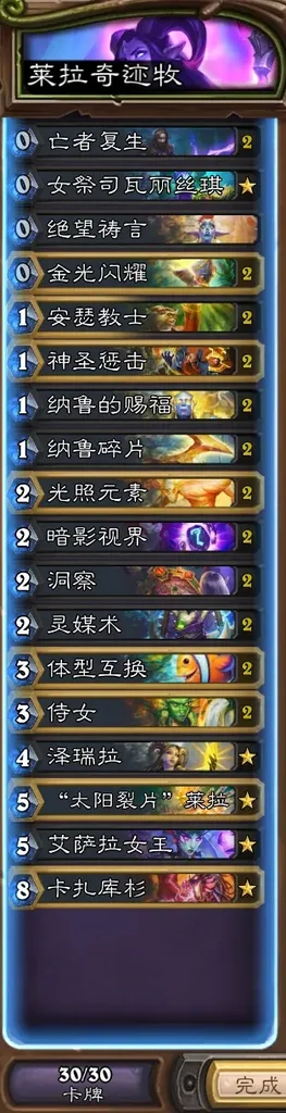 这一套是我昨天自己组的,核心还是几年前的哀黄莱拉组件,前期摸鱼携带恢复+泽瑞拉组件翻场,过穿牌库后卡扎挖宝,女王千万不要选洗法术进牌库的宝藏,其他随意。这套牌的过牌非常足,很多时候会导致哀黄莱拉起来之后爆牌,不过问题不大,但应该还有调整的空间。