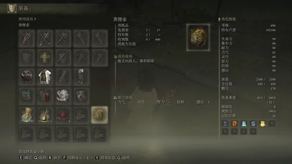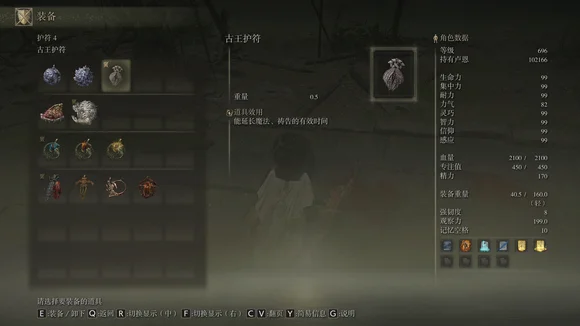 护符:腐败眷属的欢愉;鲜血君王的欢愉;葛孚雷的肖像(不使用蓄力可以换成魔法师块);古王护符;魔力对蝎;红羽七刃剑