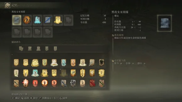 记忆:黑夜女巫烟雾;恩惠赐福/黄金树恩惠;夏玻利利的嘶吼;魔法之境