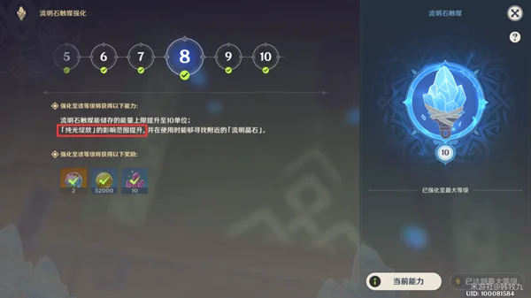 ※旅行者必须先把「流明石触媒」升级到8级才能完成该成就,8级的「流明石触媒」可以把「纯光绽放」的影响范围提升到最大。