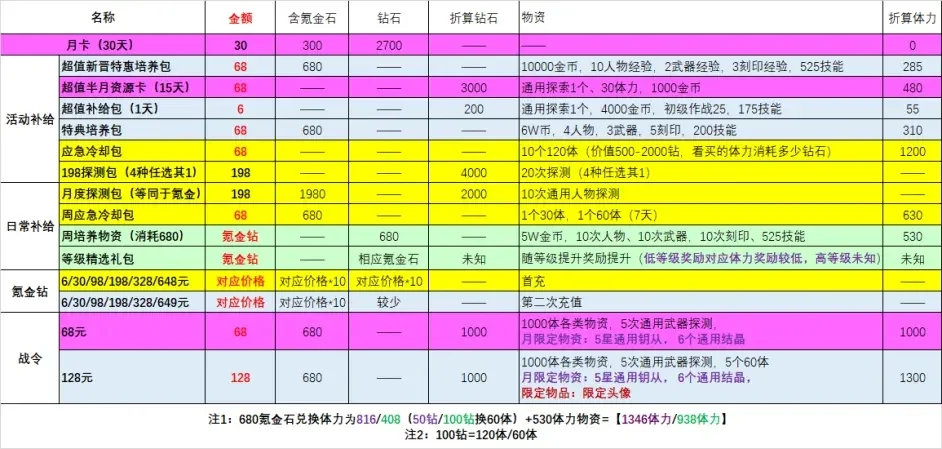 简单的说一下图表的结论就是: 除了月卡,没有性价比比较高的 (包括战令,内测期间战令的内容相当寒碜,除了可以加速武器升级的资源之外,仅相当于不买体力的5天资源)。