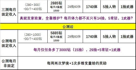 算上每日任务、每周任务、每月任务和每日签到,公测后每日福利大幅度上升,相当于三测福利基础上,每月给一张月卡以上的水平,由于还未知道【梦境再构】和【多维变量】每周能给多少钻石,但这样已经比扣扣的三测强多了,至少无氪党也敢买体力了,三测的时候,真的是体力都不敢买。