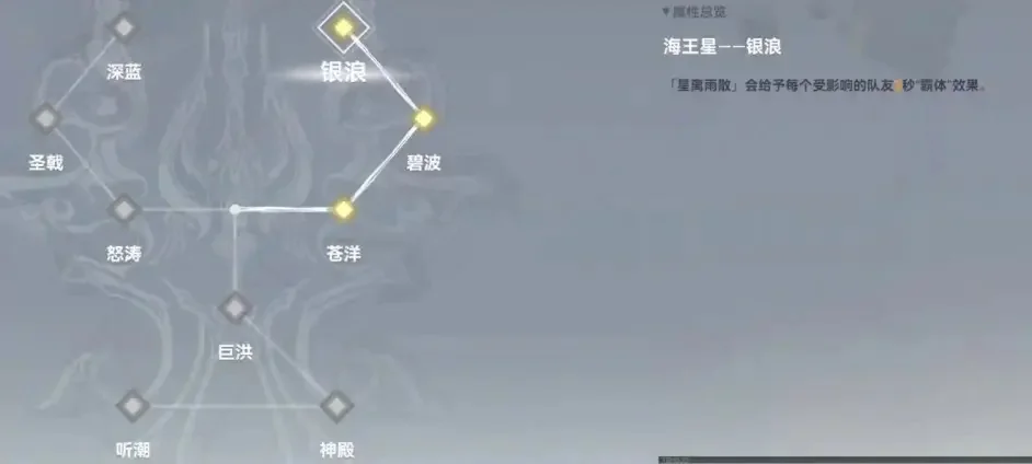 【银浪】:【星离雨散】会额外给予3秒“霸体”状态。(霸体覆盖率不高且如果是ai控制潮音,无法控制释放时机的3s霸体就显得没什么用,可以换成【巨洪】为全队增加更多攻击力,如果缺少奶量则可以换成【怒涛】)