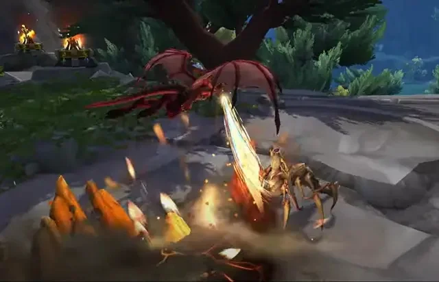 第六种:龙希尔展开双翼飞向空中,喷射火焰攻击敌人,同时还会点燃地面。这种攻击模式非常酷炫,作为红龙军团的招牌技能,它应该是一个CD很长的大招。