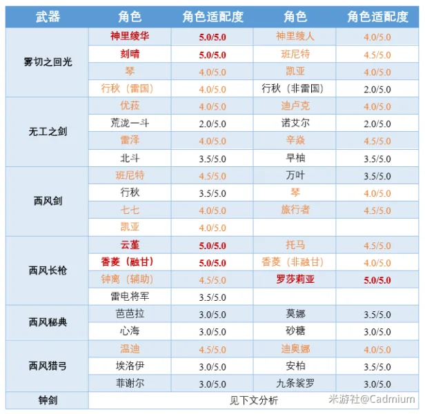 具体分析之前,先放一个包含武器与对应各角色适配度的一图流汇总(如果没有列出来,说明不太适配或不太常见),后面会有详细的解释。