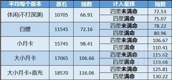 基于规律分析篇的结论和以上工具表格,考虑平均每个版本的情况并计入星辉: