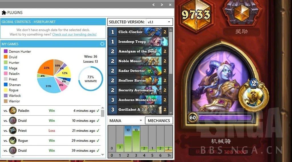 没什么好说的,就是看我们能不能前期平推,体感73开。制胜点是前期的大场面,所以解不掉的安保,通过救生员探底的沉没观月仪(2个6-4圣盾),4费的泡泡机器人群体套盾等等。需要防好对面的团本首领奥妮克希亚,一般打到中期对面连拍巨人的时候他血量也个位数了,但是对面如果有大地之鳞的话就无了。