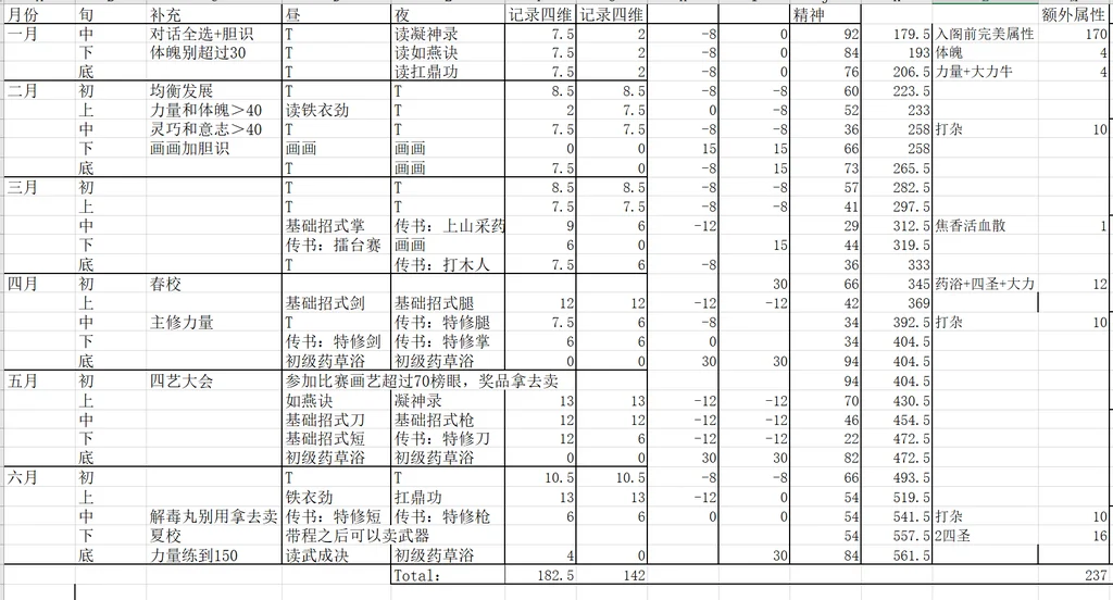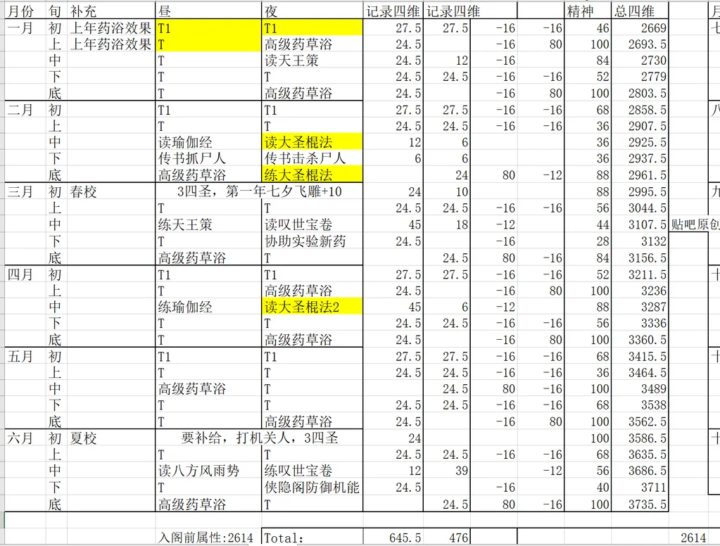 月底泡两次澡,除上述所说,剩下的三次全部练习武功或者心法就会+9属性点。