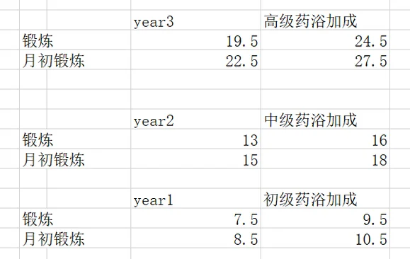 但是中级药浴在高级锻炼上+3,上年留下来的药浴效果我猜估计是背后代码逻辑问题,让我享受高级药浴效果,于是乎白嫖了6点属性