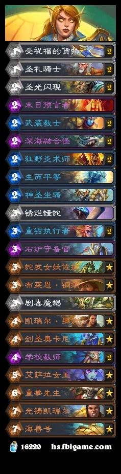 这套总共需要6费,如果小学生给铜须加了BUFF对面都可能很难解铜须,这套牌融合怪要尽量发现纳迦,圣骑士是唯一一个职业随从里没有娜迦的,这样新版本融合怪发现5费女王的概率大幅上升。