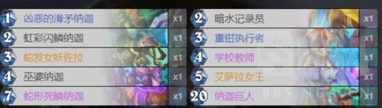 中立有2个纳迦,一个是4费44触发后打3的巫婆纳迦,1个7费59,触发效果是打3的AOE,这两个随从也是可用来中后期斩杀打AOE的,还能发现佐拉。