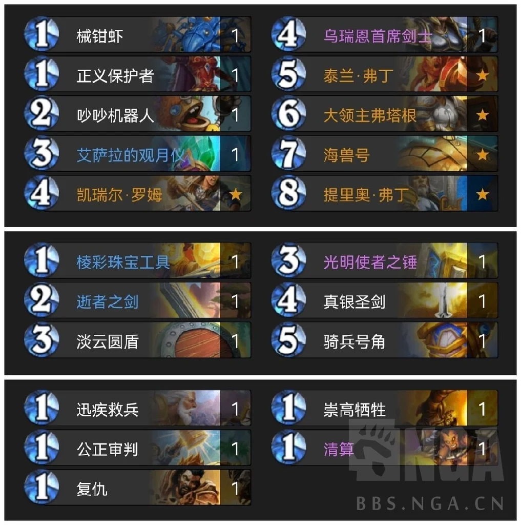 而圣盾随从,443突袭减神圣法术费用和7费新橙卡机械巨型都是非常好的解场节奏利器(佛丁只能算添头啦)。