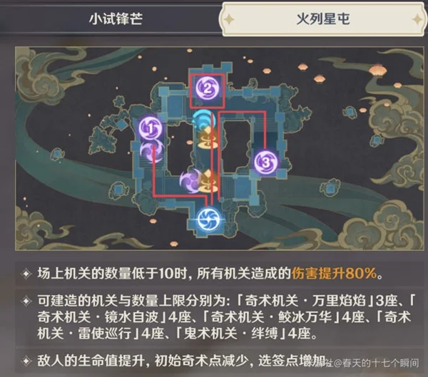火列星屯这关里,我们要利用“场上机关的数量低于10%时,所有机关造成的伤害提升80%”这点来达成3000分通关。