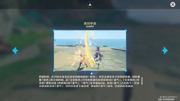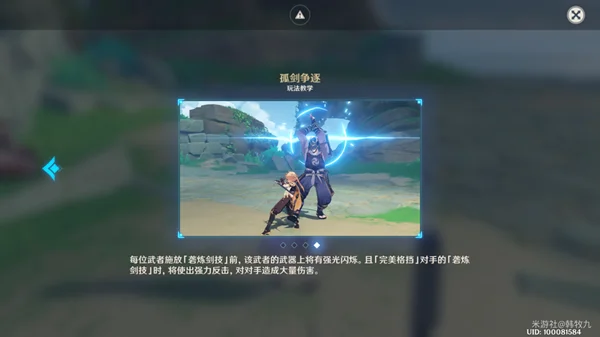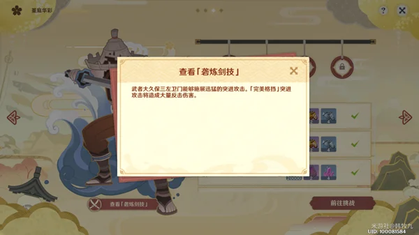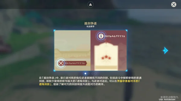 ▶在「孤剑争逐」中,旅行者对阵的每位武者都拥有不同的剑技,包括战斗中频繁使用的普通剑技,和较少使用但极为强大的「砻炼剑技」。与武者对话后,可以在界面中查看对手的「砻炼剑技」。
