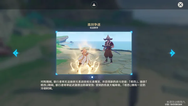 ▶对阵期间,旅行者将无法施放元素战技和元素爆发,并获得新的战斗技能「格挡」(代替元素战技)。施放「格挡」期间,旅行者将举起武器摆出防御架势:受到的伤害大幅降低。
