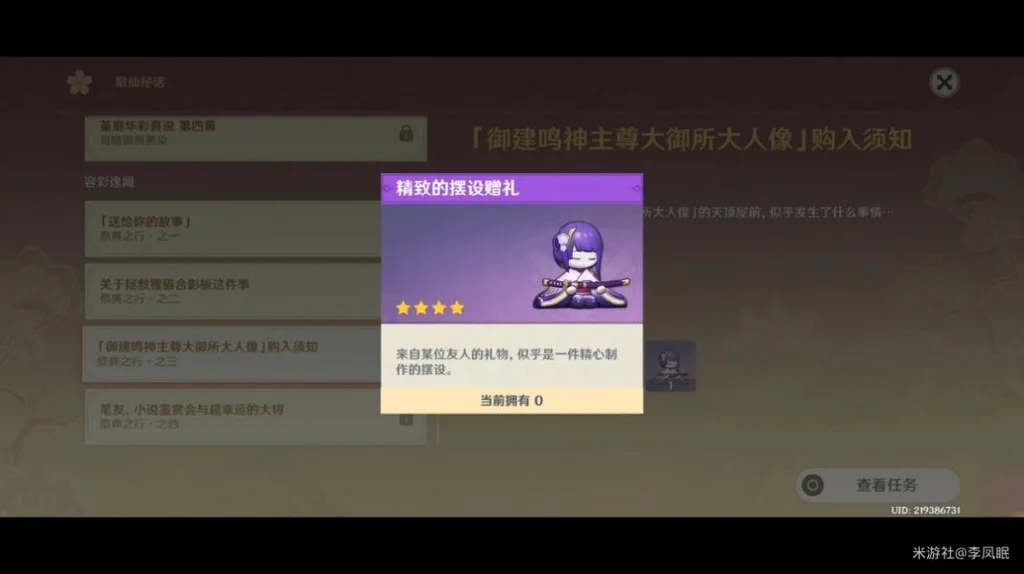 原神精致的摆设赠礼是雷电将军的人偶手办,那么这个道具该怎么获得呢?相信大家还不清楚,下面一起来看原神精致的摆设赠礼获取方法。