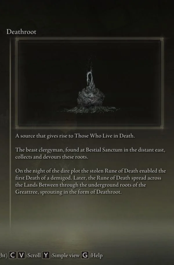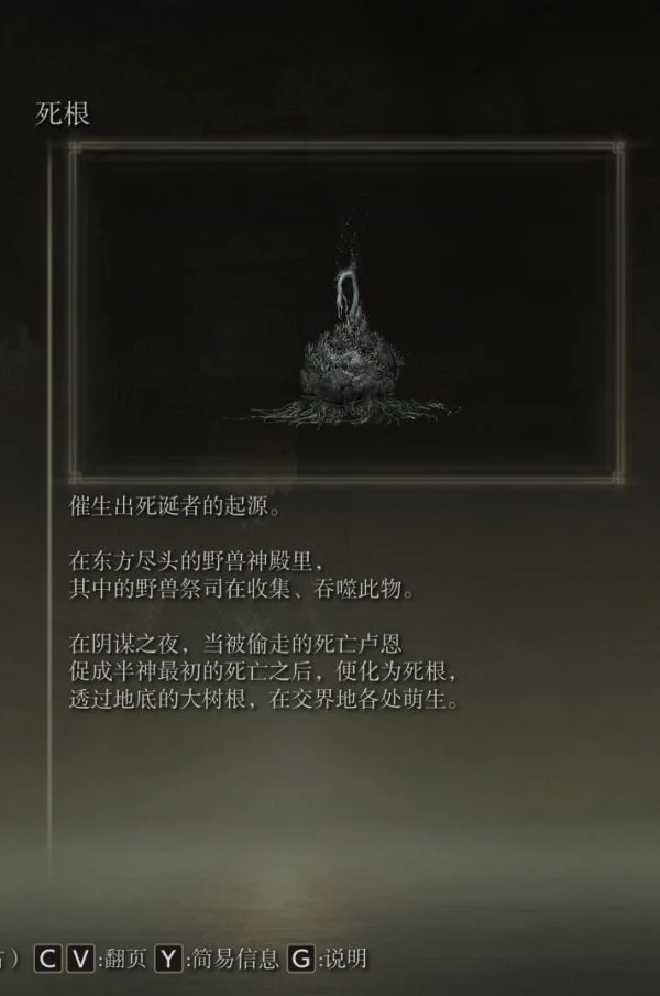 在更新永恒之城前,先来讲一下前面有个吧友给我的提醒,有关于亵渎兽爪的观点,亵渎兽爪并不是全部被盗走的死亡卢恩(命定之死),野兽祭祀让咱们收集的死根也是被盗走的部分死亡卢恩,具体来看死根的中英文描述。