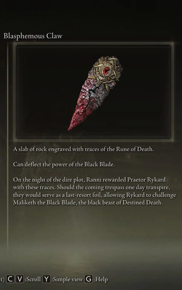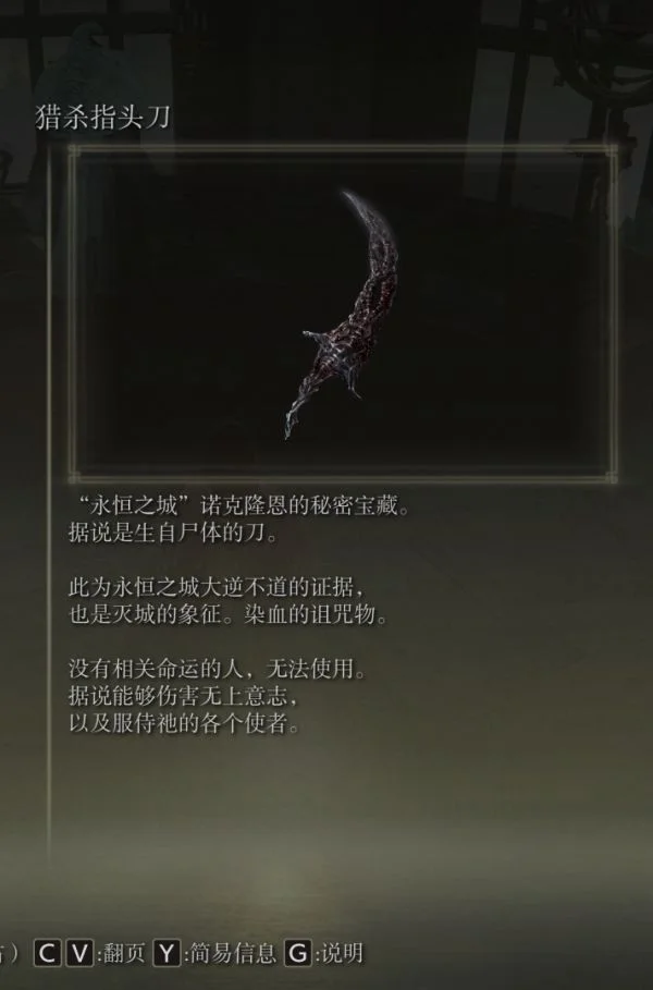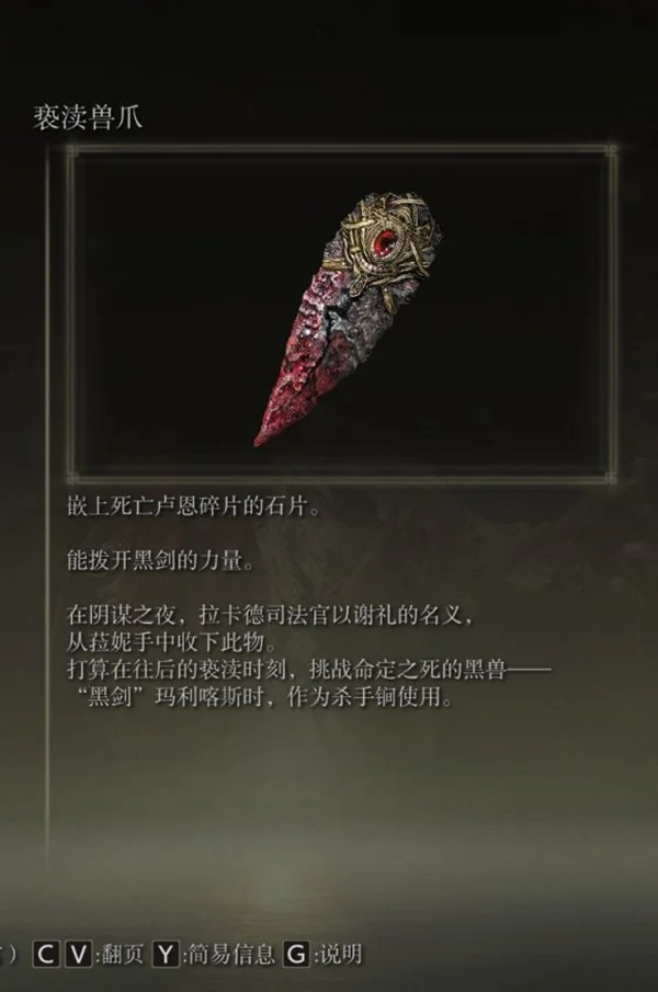 所以先来总结一下,上面提到的观点,第一,死亡卢恩和命定之死是一个东西,不同名字而已。第二,死王子的修复卢恩是新造的一个卢恩,为的是让死诞者合理存在于这个世界,就像老八搓的卢恩一样,可能会有人好奇失窃的那部分死亡卢恩去哪了,其实有表明的,我们来看在天空城得到的一个物品,亵渎兽爪的中英物品描述。