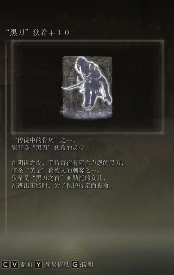 之后将黑刀之首亚勒托击败,可以得到一个黑刀狄希的骨灰,由物品描述我们可以得知,狄希是亚勒托的女儿,在阴谋之夜刺杀黄金葛德文的刺客之一,之后为掩护母亲亚勒托逃出王城牺牲,亚勒托则一直拿着女儿狄希的骨灰,至于之后为何黑刀之首亚勒托为何被抓且关押在月光祭坛我们不得而知,没有文本线索。