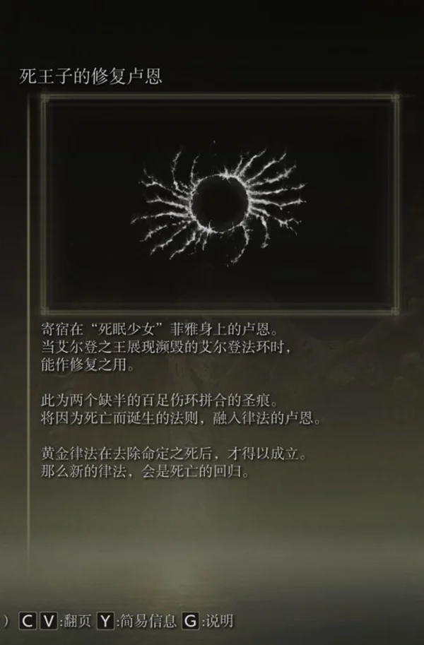 这里面有一个很大的误区就是以为菈妮的咒痕是一半的死亡卢恩,也就是被盗走的那一部分,二者结合让死亡卢恩再次完整,但其实并不是。这里我们可以看黑剑的描述,黑剑把大黑剑封印在了自己的身体里,为的是防止再次失窃,那么之前失窃的是什么? 是一部分死亡卢恩。所以可以得出实际上最原本的死亡卢恩就是这把大黑剑,注意在大黑剑的缺了一块。而这个死王子的修复卢恩是一个新的卢恩。