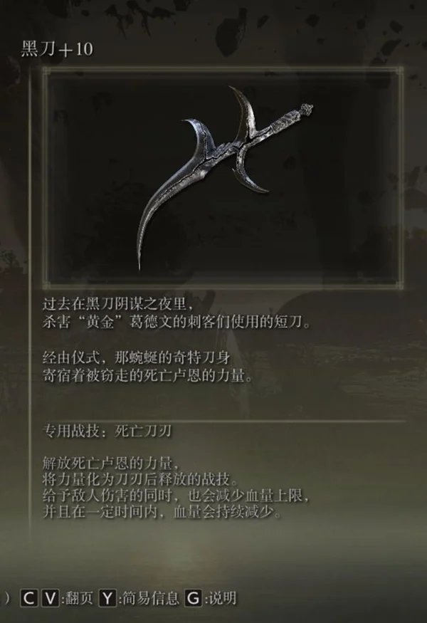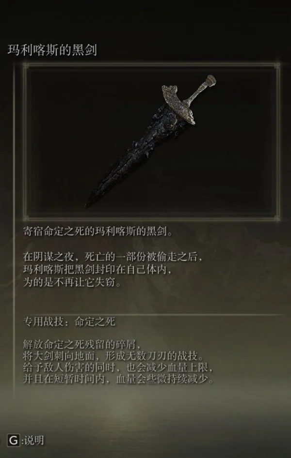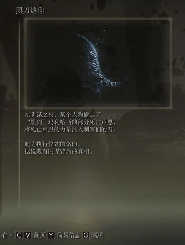 注意,上面的黑刀烙印并不是被盗走的死亡卢恩本身,而是执行附魔仪式留下来的一种烙印(痕迹),这个仪式把死亡卢恩的力量,注意只是力量,附魔在了黑刀的武器上,再来看黑刀的描述,是寄宿,但只是力量,而不是被窃走的死亡卢恩本身,接下来我会具体说,之后我们再来区分一下死王子的修复卢恩,死亡卢恩和命定之死三者的区别,首先来看一下我们做完野兽祭祀的支线后首次打黑剑的台词对话。