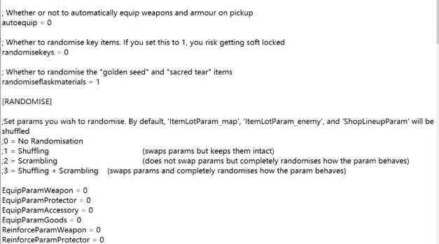 关键配置,建议设置1,地图和敌人掉落随机。注意:会导致某些剧情凋落物失效,比如老将欧尼尔的纯净金针,建议在战斗之前关掉并删除txt文件重新配置,打完之后再开启。