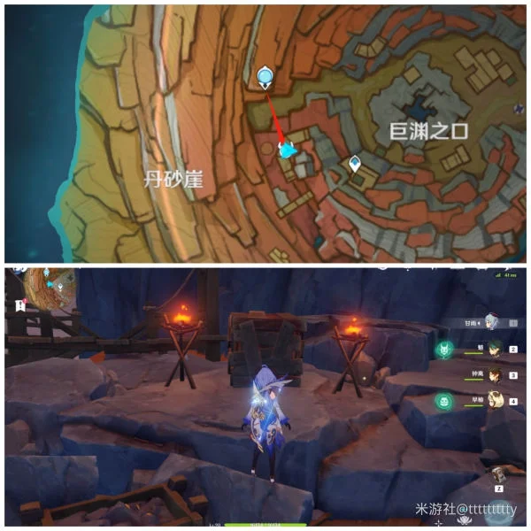 1.传送至巨渊之口左侧七天神像处,朝着右前方滑翔至下图所示位置。在两个火堆中间有一个大木箱。