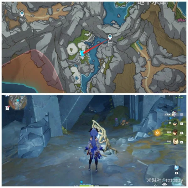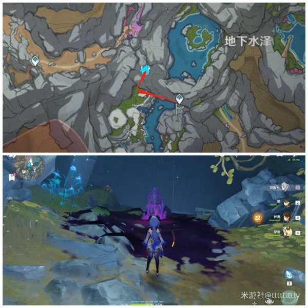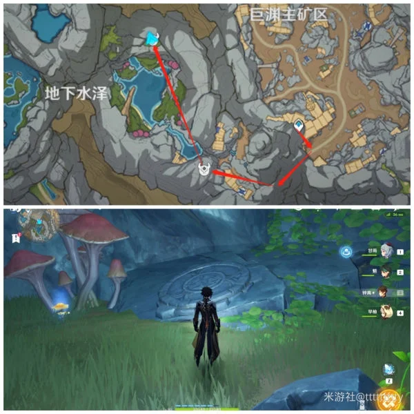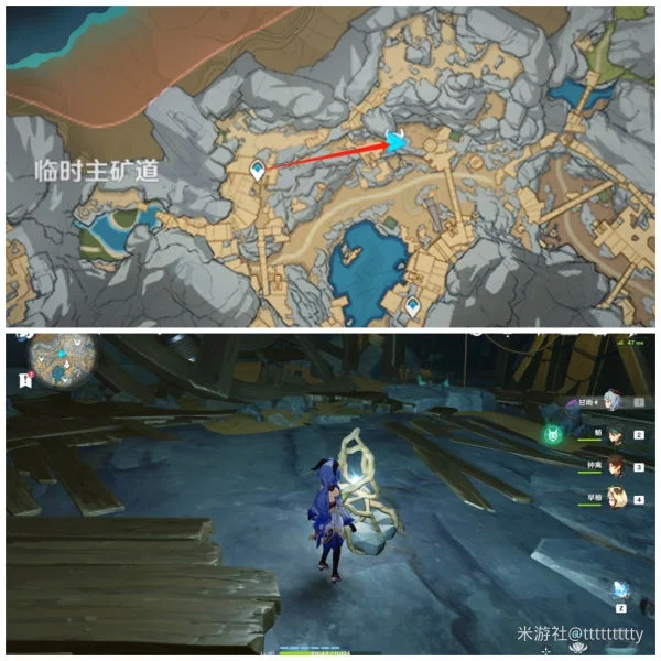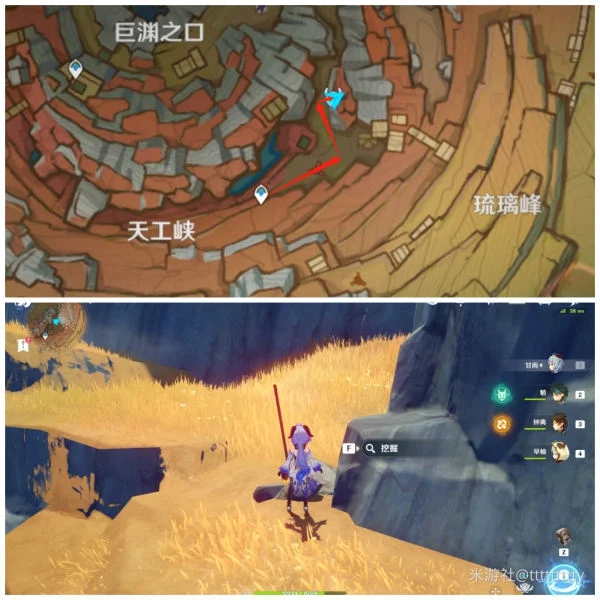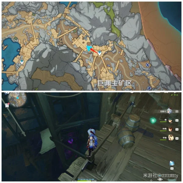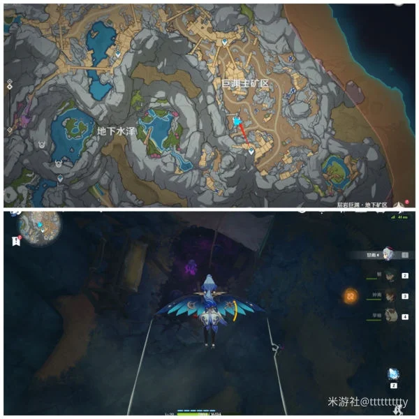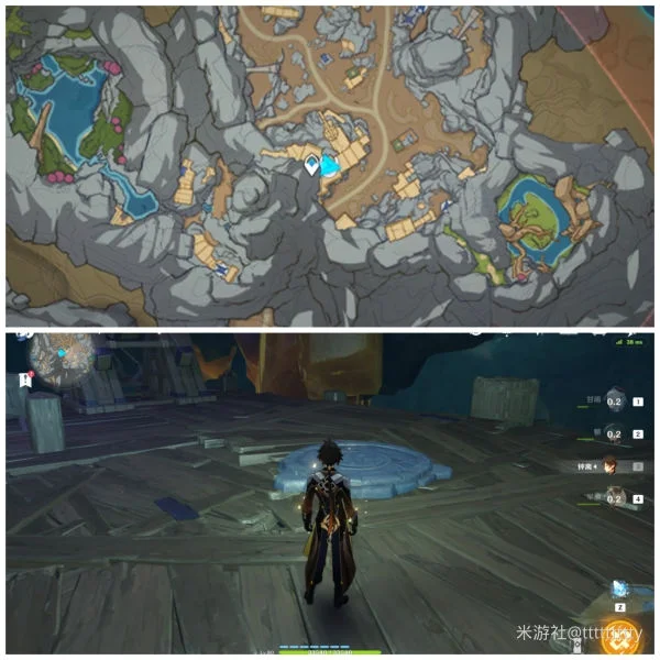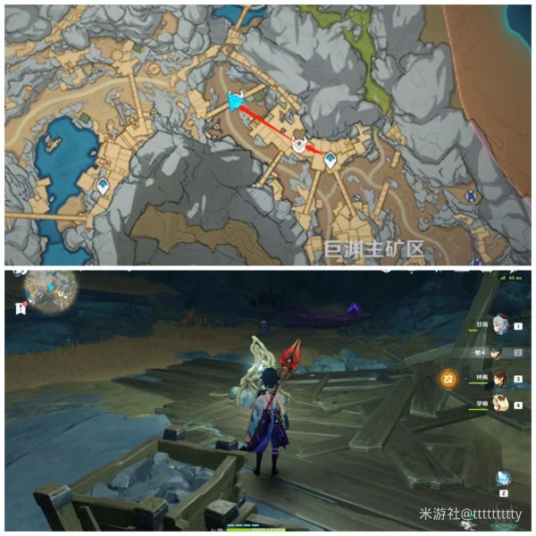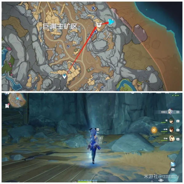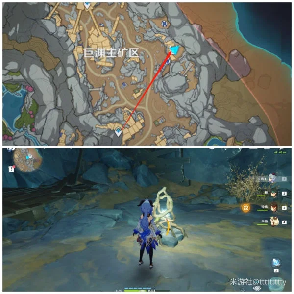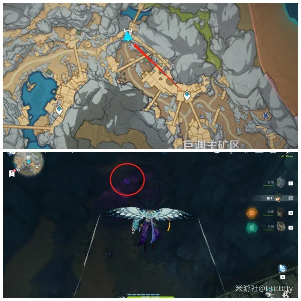 15.传送至巨渊主矿区上方传送点,后转身向前方滑翔至下图所示淤泥处,接着降落下来即可。