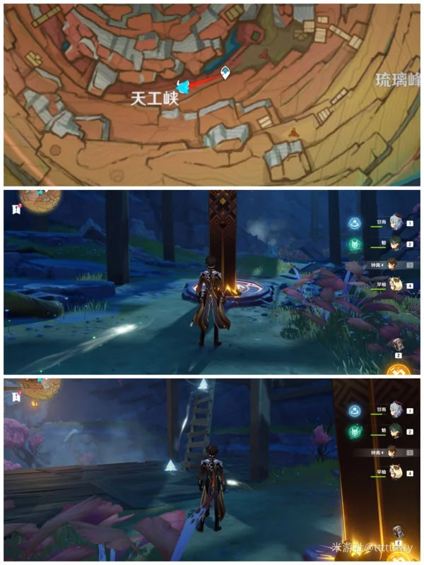 4.传送至天工峡右侧传送点,后转身跨过木桥,来到下图所示圆盘处,将钟离或岩主的岩造物立在上面,然后在岩造物持续时间结束之前,将这些发光的小颗粒收集齐即可。