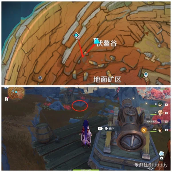 5.传送至地面矿区右侧传送点,爬上左侧的山崖,如下图所示,上面有一只丘丘人在压力板上跳舞,这里我们可以直接拾取左侧的宝箱。