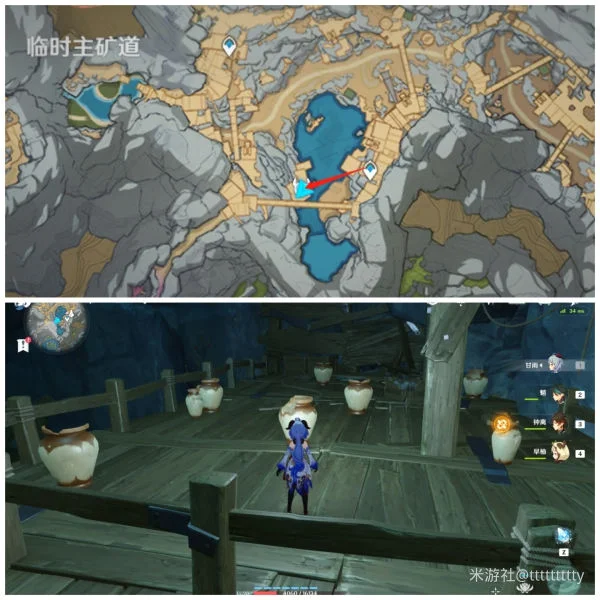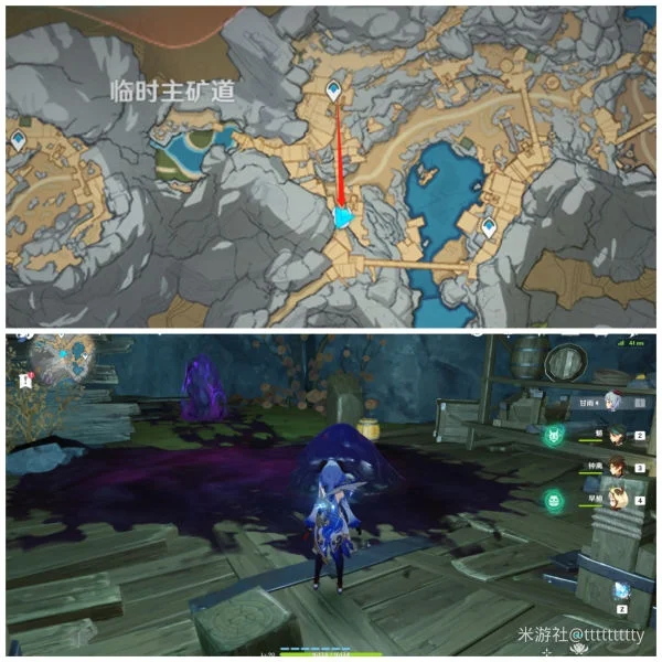 33.传送至巨渊主矿区下方传送点,右转跳至下方,从进入下方山洞后直行,土路右侧会有一条通道,右转沿着通道直行至下图帐篷处,净化淤泥即可获得宝箱。
