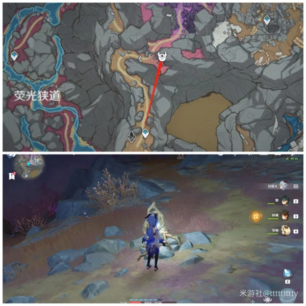31.传送至荧光狭道上方传送点,右转直行至下图所示位置,此处是一个枯木宝箱。四个紫石位置以下图角色为基准,前方两个,右侧一个,后方一个。