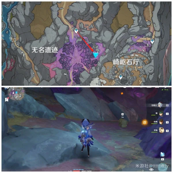 25.回到传送点,向着左前方滑翔,此处是一个枯木宝箱,四个紫石位置以下图甘雨为基准,左侧一个,后方两个,前方一个。